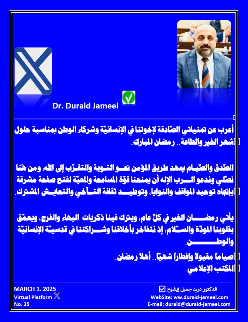 أعرب عن تمنياتي الصّادقة لإخوتنا في الإنسانيّة وشركاء الوطن بمناسبة حلول شهر الخير والطاعة… رمضان المبارك.