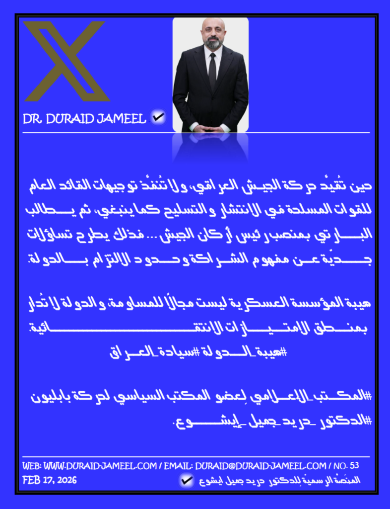 حين تُقيَّد حركة الجيش العراقي، ولا تُنفَّذ توجيهات القائد العام للقوات المسلحة في الانتشار والتسليح كما ينبغي، ثم يطالب البارتي بمنصب رئيس أركان الجيش… فذلك يطرح تساؤلات جدّية عن مفهوم الشراكة وحدود الالتزام بالدولة.