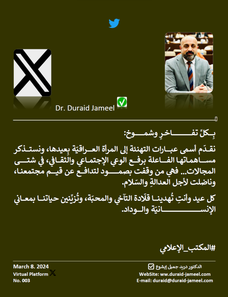 نقدّم أسمى عبارات التهنئة إلى المرأة العراقيّة بِعيدها، ونستذكر مساهماتها الفاعلة برفع الوعي الإجتماعي والثقافي، في شتى المجالات… فهي من وقفت بصمود لتدافع عن قيم مجتمعنا، وناضلت لأجل العدالةِ والسّلام.