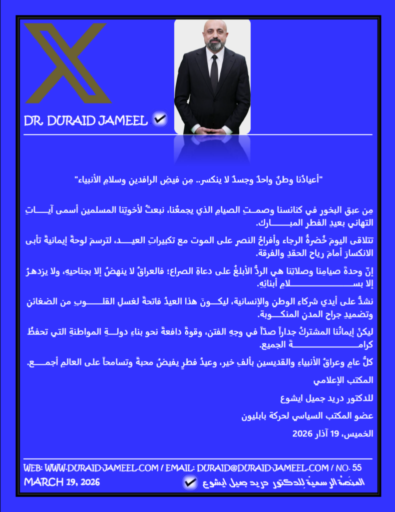 كلُّ عامٍ وعراقُ الأنبياءِ والقديسين بألفِ خير، وعيدُ فطرٍ يفيضُ محبةً وتسامحاً على العالمِ أجمع.