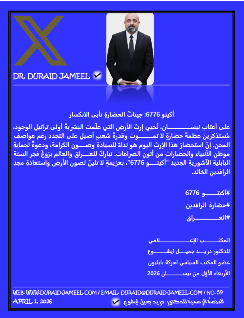 على أعتابِ نيسان، نُحيي إرثَ الأرضِ التي علّمت البشريةَ أولى تراتيلِ الوجود، مُستذكرينَ عظمةَ حضارةٍ لا تموت وقدرةَ شعبٍ أصيلٍ على التجددِ رغم عواصفِ المحن. إنّ استحضارَ هذا الإرثِ اليوم هو نداءٌ للسيادةِ وصونِ الكرامة، ودعوةٌ لحمايةِ موطنِ الأنبياءِ والحضاراتِ من أتونِ الصراعات. نباركُ للعراقِ والعالمِ بزوغَ فجرِ السنةِ البابليةِ الآشوريةِ الجديد “أكيتو 6776″، بعزيمةٍ لا تلينُ لصونِ الأرضِ واستعادةِ مجدِ الرافدينِ الخالد.