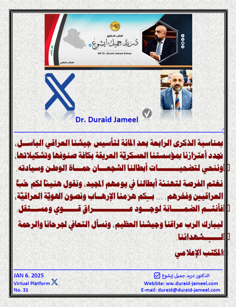 بمناسبة الذكرى الرابعة بعد المائة لتأسيس جيشنا العراقي الباسل، نجدد أعتزازنا بمؤسستنا العسكريّة العريقة بكافة صنوفها وتشكيلاتها، وننحي لتضحيات أبطالنا الشجعان حماة الوطن وسيادته.