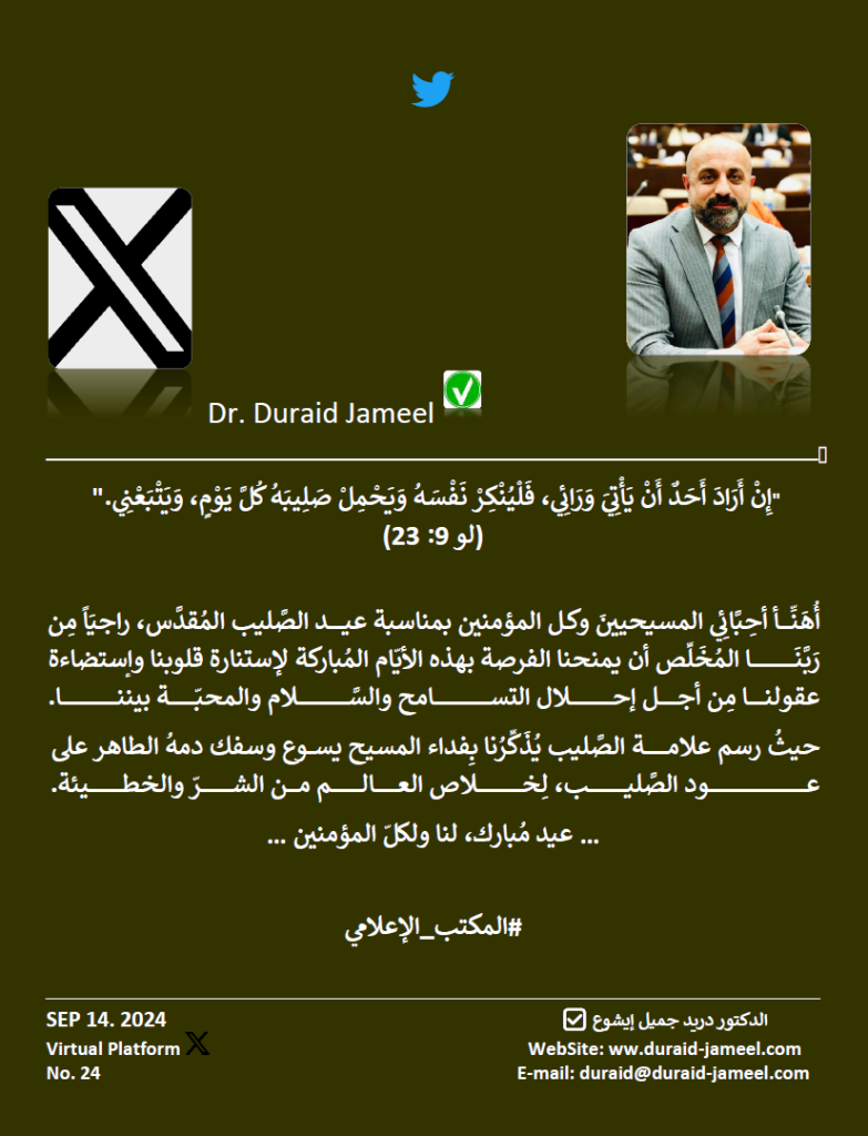 أُهَنِّأ أحِبَّائِي المسيحيينَ وكل المؤمنين بمناسبة عيد الصَّليب المُقدَّس، راجيَاً مِن رَبَّنَا المُخَلِّص أن يمنحنا الفرصة بهذه الأيّام المُباركة لإستنارة قلوبنا وإستضاءة عقولنا مِن أجل إحلال التسامح والسَّلام والمحبّة بيننا.