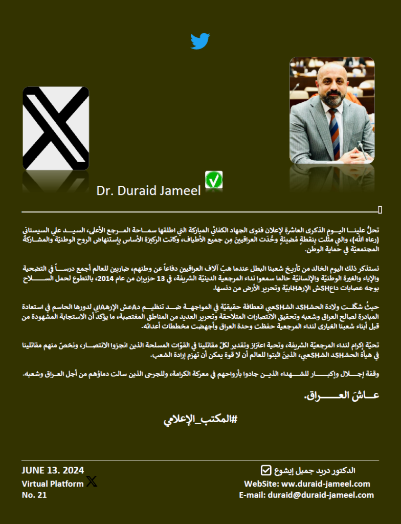 نستذكر ذلك اليوم الخالد من تأريخ شعبنا البطل عندما هبّ آلاف العراقيين دفاعاً عن وطنهم، ضاربين للعالم أجمع درساً في التضحية والإباء والغيرة الوطنيّة والإنسانيّة حالما سمعوا نداء المرجعية الدينيّة الشريفة، في 13 حزيران من عام 2014، بالتطوع لحمل السلاح بوجه عصابات داعSHـش الإرهـHـابيّة وتحرير الأرض من دنسها.