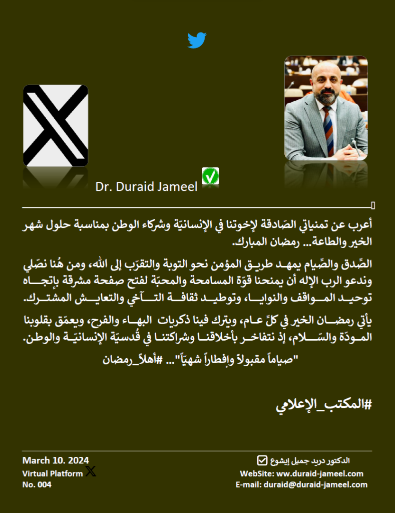أعرب عن تمنياتي الصّادقة لإخوتنا في الإنسانيّة وشركاء الوطن بمناسبة حلول شهر الخير والطاعة… رمضان المبارك.