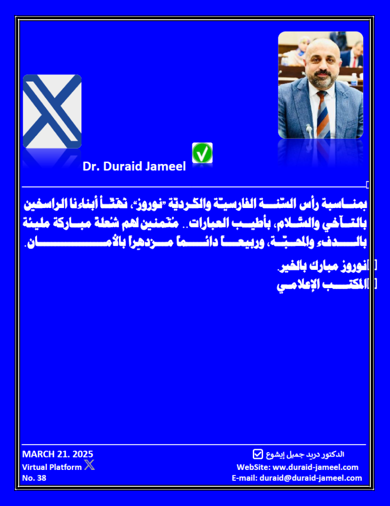 بمناسبة رأس السّنة الفارسيّة والكُرديّة “نوروز”، نُهَنِّأ أبناءنا الراسخين بالتآخي والسَّلام، بأطيب العبارات.. مُتَمنين لهم شُعلةً مباركة مليئة بالدفء والمحبّة، وربيعاً دائماً مزدهِراً بالأمان.