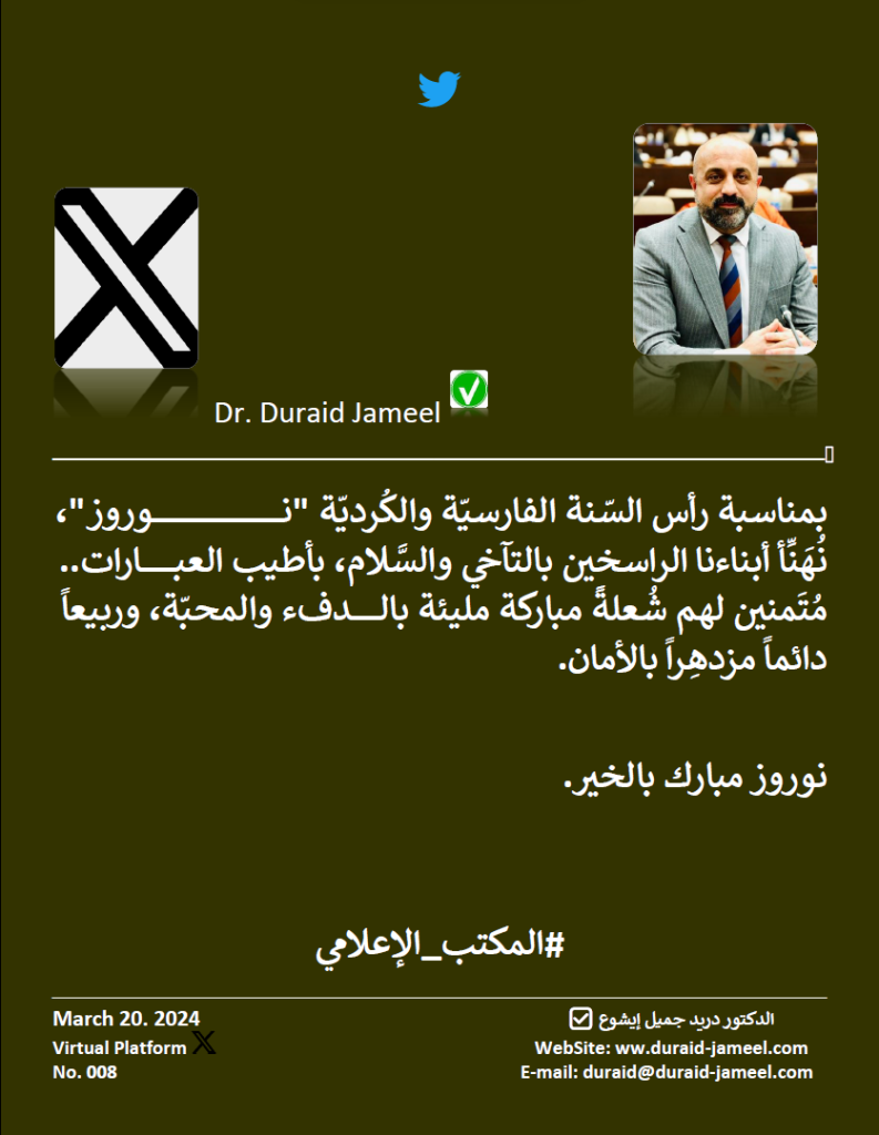 بمناسبة رأس السّنة الفارسيّة والكُرديّة “نوروز”، نُهَنِّأ أبناءنا الراسخين بالتآخي والسَّلام، بأطيب العبارات.. مُتَمنين لهم شُعلةً مباركة مليئة بالدفء والمحبّة، وربيعاً دائماً مزدهِراً بالأمان.