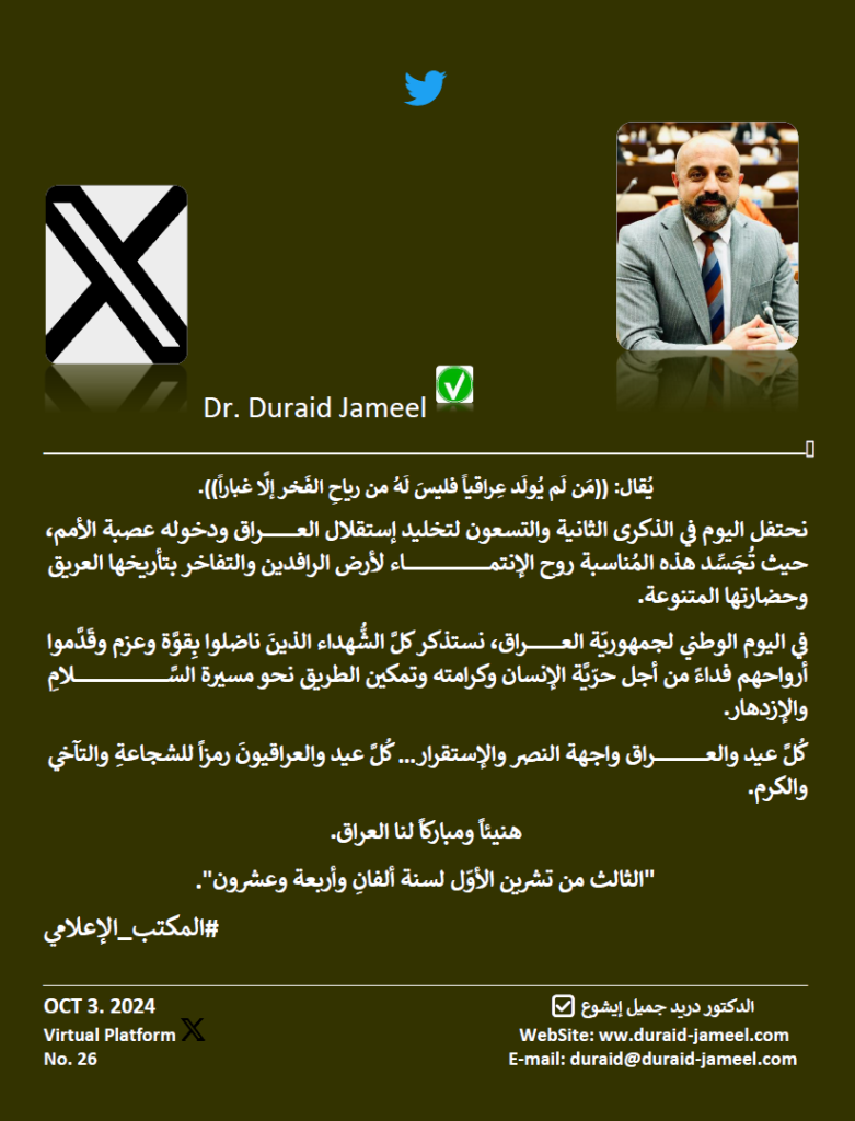 نحتفل اليوم في الذكرى الثانية والتسعون لتخليد إستقلال العراق ودخوله عصبة الأمم، حيث تُجَسِّد هذه المُناسبة روح الإنتماء لأرض الرافدين والتفاخر بتأريخها العريق وحضارتها المتنوعة.