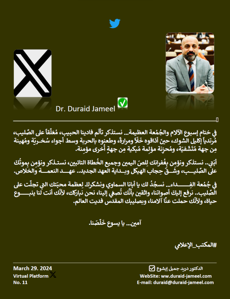 في ختام إسبوع الآلام والجُمُعة العظيمة… نستذكر تألّم فادينا الحبيب، مُعَلَّقاً على الصَّليب، مُرتدياً إكليل الشوك، حينَ أذاقوه خَلّاً ومرارةً، وطعنوه بالحربة وسط أجواء سُخريّة ومُهينة مِن جهة مُتَشَفيّة، ومُحزِنة مؤلِمة مُبكية مِن جهةٍ أُخرى مؤمِنة.