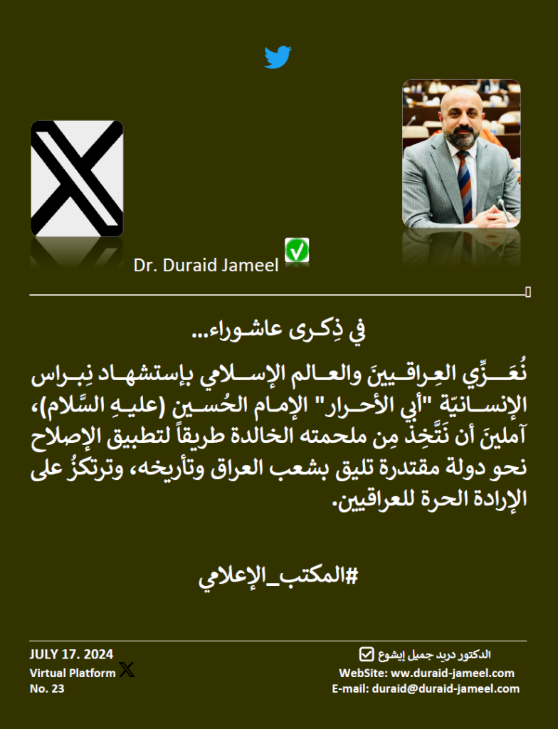 نُعَزِّي العِراقيينَ والعالم الإسلامي بإستشهاد نِبراس الإنسانيّة “أبي الأحرار” الإمام الحُسين (عليهِ السَّلام)، آملينَ أن نَتَّخِذ مِن ملحمته الخالدة طريقاً لتطبيق الإصلاح نحو دولة مقتدرة تليق بشعب العراق وتأريخه، وترتكزُ على الإرادة الحرة للعراقيين.