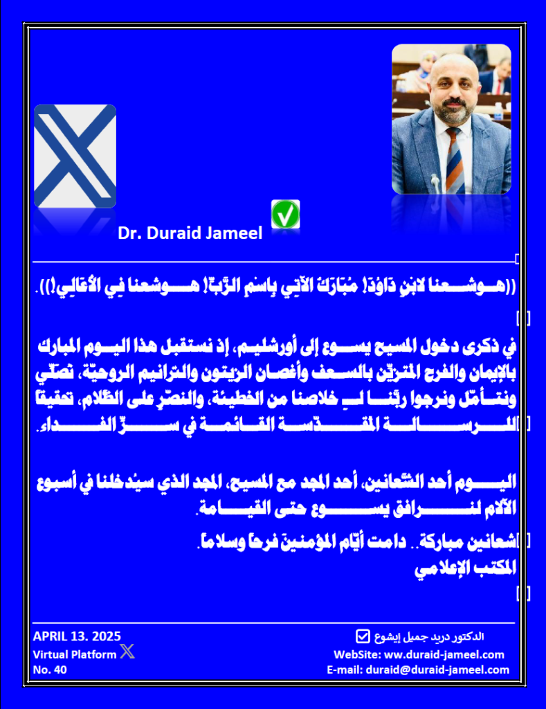 في ذكرى دخول المسيح يسوع إلى أورشليم، إذ نستقبل هذا اليوم المبارك بالإيمان والفرح المُتزيِّن بالسعف وأغصان الزيتون والترانيم الروحيّة، نُصَلِّي ونتأمّل ونرجوا ربَّنا لـِ خلاصنا من الخطيئة، والنصّرِ على الظَّلام، تحقيقاً للرسالة المُقدّسة القائمة في سرِّ الفداء.